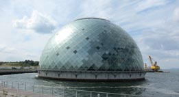 巨大な海上楼がぽっかりと浮かぶ。画像は、そのドーム型展示棟への入場口が設けられたエントランス棟(陸地側に建つ)から眺めたものである。