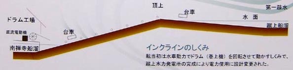 インクラインは、蹴上船溜や南禅寺船溜に到着した船から乗り降りすることなく、この坂を船ごと台車に載せて昇降させる目的で