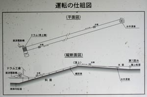 当初蹴上から分水した水車動力 (20馬力、15KW) によって水車場内のウインチ (巻上機) と水中の滑車を回転、ワイヤーロープで