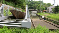 画像に写るのは、蹴上と南禅寺の両船溜のほぼ中間地に展示された船架台車と木造船である。この船(三十石船)は琵琶湖疏水で使用