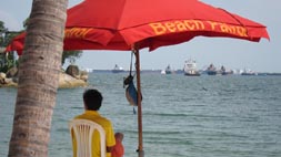 2. 海辺で遊ぶ人たちの安全を見守る監視員。沖合には数えきれないほどの船舶が停泊する。その向こう側にはシンガポール海峡