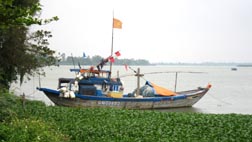 1. トゥーボン川岸に係留された漁船。ホイアンの町がある下流方向を見る。 [拡大画像: x25027.jpg]