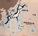 1. 日本の200海里EEZ図。右最下端の円形が南鳥島のEEZである。 (出典: 「船の科学館」展示 2011.8.31)