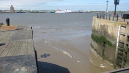3. マージー川は引き潮のために水位が数メートルほど低下している。画像背後にはカニング・ドックがあり、