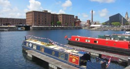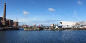 この水路で結ばれている。画像は水路に架けれれた水門兼歩道橋から撮影したもの。マージー川の対岸に見えるのは、