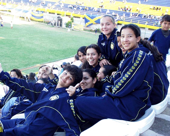 笑顔の女子高生 Estudiantes en la Cancha de Futbolパラグアイ人はみんなサッカーが大好きだ。 地元サッカーチーム「ルケーニョ」に声援を送る女子高生。 サッカーに熱狂していても、写真を撮られる時にはポーズを取ることを忘れない。