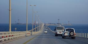 サウジアラビアからバーレーンへの行路 1 2 1. [拡大画像(x16501.jpg)][拡大画像(x16502.jpg)] 2. [拡大画像(x16503.jpg)][拡大画像(x16504.jpg)] アラビア半島のサウジアラビアからアラビア湾に浮かぶ島国バーレーンを埋め立て道路のコーズウェイが結ぶ。 その中間に人工島があって両国官憲によるパスポートコントロールを受ける。