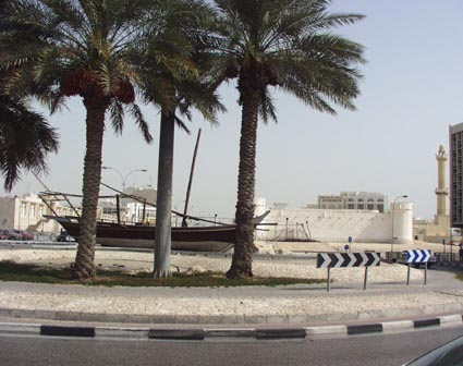 1. 首都ドーハのダウン・タウンにある「ダウ船のラウンドアバウト」。ロータリーの中央に実物大の