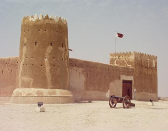 小型ダウ船がモニュメント風に置かれている。その後には「ドーハ要塞」(Doha Fort)が見える。