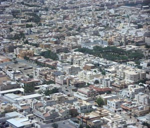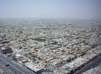 An Aerial View of Riyadh, Saudi Arabia 首都リヤドには、高さ300メートルくらいはありそうな2つの超高層ビルがある。 「Kingdom Tower」の高層階から見渡せば、ボールペンの先端のように尖った形をして、 天空に突き刺すようにそびえ立つ、もう一つの超高層ビルがいやおうなく視界に飛び込んでくる。 10km先からでも見える超高層ビルだが、リヤドを取り巻く砂漠に風が少しでも強く吹くと、 砂色に染まった空に溶け込んで、消えてなくなってしまうこともしばしばである。 この2本の超高層ビルは街のランドマークであり、自分が市内のどの辺りにいるのか位置を教えてくれる ありがたい「羅針盤」である。[2006.06の風景]