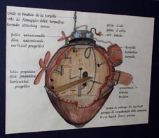 建造した人力式潜水器「トータス号(Tortoise)」の実物大模型が歓迎してくれる。