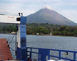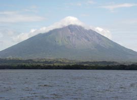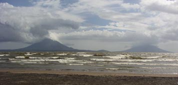 1. 本土のサン・ホルヘ港からオメテペ島を遠望する。左がコンセプション火山、右がマデーラ火山。