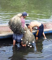 網を片付ける親子。親は黙々と作業、その側で息子はほとんど手伝いをしなかった。見届けなかったが、最後は息子が