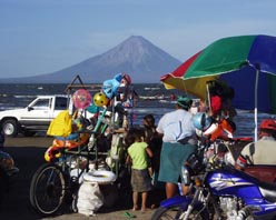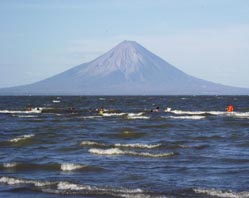 ニカラグア湖とオメテペ島 ニカラグアの首都マナグアからパンアメリカン・ハイウェイを南東の隣国コスタリカに向けてドライブ すること約2時間、やがて左手に中米で最大のニカラグア湖(淡水湖。淡水サメが棲息するとのこと)に 浮かぶオメテペ島の火山が見えてくる。