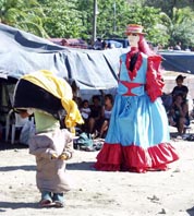 1. 背丈のある「竹馬人形」が小鼓笛隊に合わせて踊る、海辺の大道芸人。 [拡大画像(x19303.jpg)]