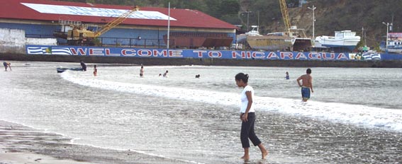 時とともに斜陽は海面を白銀の世界へと変えて行く。 岸壁やドックヤードの屋根には、「Welcome to Nicaragua」、「Welcome to San Juan del Sur」と記され、 この小さな港町を訪れる外国人マドロスたちを歓迎している。(2004年2月)