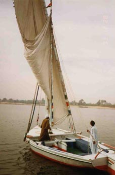 ナイル河を行き来する小さな帆掛け船。 「ファルーカ」と呼ばれる。 実際に乗ってみると、その三角帆の意外な大きさに驚かされる。ルクソールにて[1993.12] [参考]felucca: n.[船]フェラッカ、フェラッカ船、ファルーカ、フィラカ [地中海、特にアフリカ北岸での航行に用いられる、 3本マストに三角帆の無甲板の快速・小型沿岸航行帆船; エジプト・ナイル川でも見られる; アラブ語で「フェルーカ」、 日本語では「フェラッカ」という]; 小帆船.