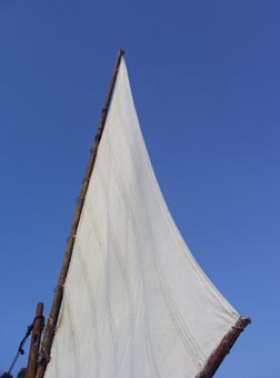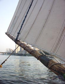 ファルーカの船頭は慣れた手つきで、舵と帆桁を操りながらタッキングを繰り返す。 1時間のクルージング