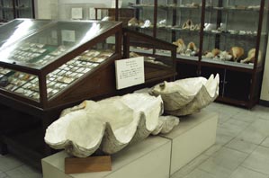 - [画像(x35.jpg)]館内の展示(1)。中央下部にオオジャコガイ(giant clam;