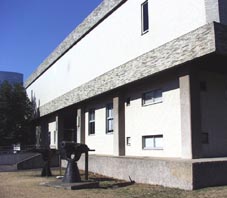 1. [画像(x6662.jpg)]資料館とその正面玄関前に置かれた捕鯨砲。