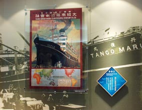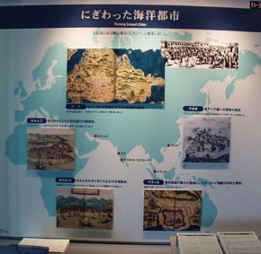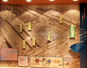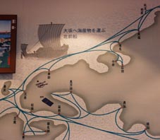 6 7 8 6. 大阪港は、港の整備と産業の近代化により昭和14年(1939年)には日本一の取扱貿易量を誇った。 「世界に活躍する大阪商船(株)」のポスター。日本と北米、NY、南米、欧州などとの間で定期航路をもつ大阪商船の 活躍を示す。 [拡大画像(x7609.jpg)] 7. 商業都市・大坂の発展: 天保山、住吉高とうろうなども示されている。[拡大画像(x7610.jpg)] 8. べか車: 板状の車輪が特徴。最盛期の文政7年(1824年)には1678台と定められていた。[拡大画像(x7611.jpg)]