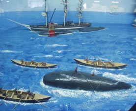 4. [拡大画像(x8140.jpg)][拡大画像(x8141.jpg)]1750年頃(最盛期)のアメリカ式帆船捕鯨のジオラマ。