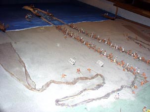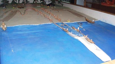 1. 地引き網の模型。浜で網を引いている人を「引子」という。