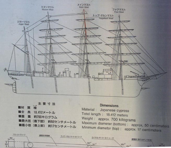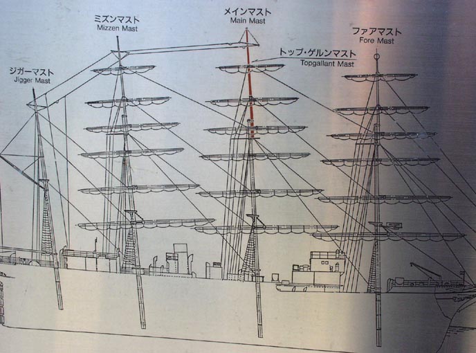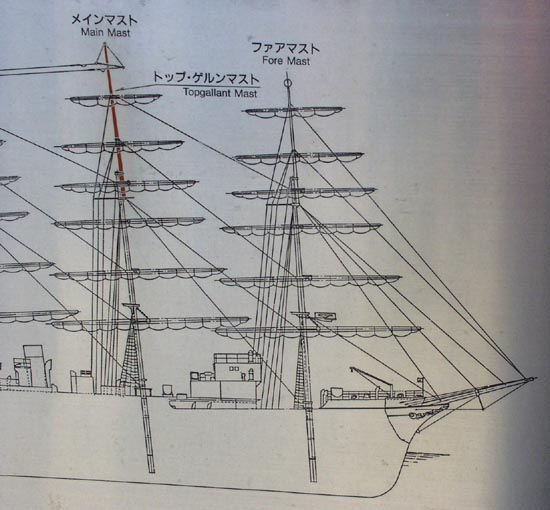 超拡大画像(約300KB): フォアマスト(fore mast)、メーンマスト(main mast)、ミズンマスト(mizzen mast)、