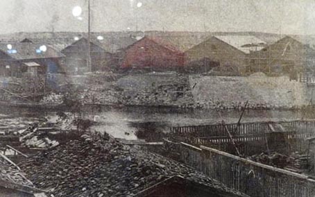 4. キャプションには「創業時の山居倉庫建設風景」と記されている。