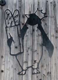 が描かれ、道路際に立つ髙い広告塔。フランスパン2本が入った紙袋を抱えるペンギンの絵が目印である。