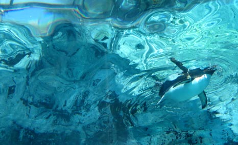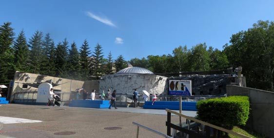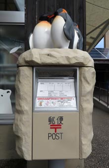 北海道・旭川市・旭山動物園にて/1&2.「ペンギン館」とそこで泳ぐペンギン、3.園内の〒ポストとペンギン像/2022.6.21訪問