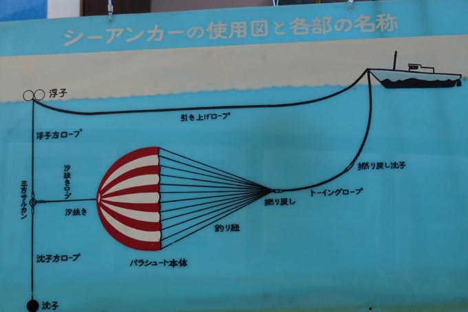 画像は、漁船がその船首を風上に立てながらシーアンカーをトーイング(towing)する模型である。撮影は山形県酒田市の「酒田海洋センター」