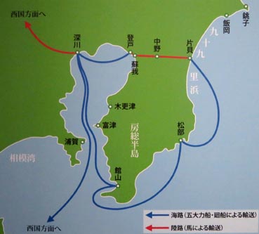 前者は外海廻りといい、松部・館山を経て深川へ、他方後者では東金街道を中野・蘇我へ、さらに登戸を経て、そこから船で深川