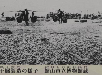 干鰯(ほしか)(画像3)の製造工程についてのパネル説明によれば、干鰯は砂浜にイワシを撒いて天日乾燥させた(イメージとしては画像5