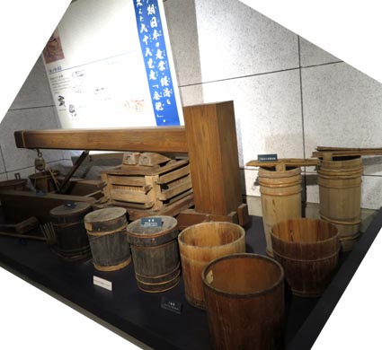 ための圧搾装置「キリン」と製造関連容器である。展示説明パネルには概略次のように記される。