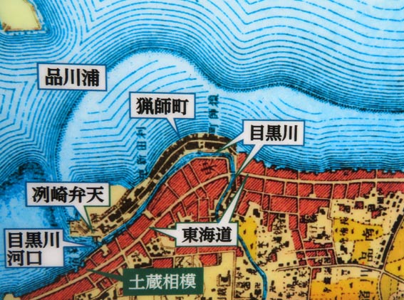 画像2は旧東海道に沿った「品川宿」辺りの古地図である。地図上の「冽崎(すさき)弁天」が「州崎(すさき)弁天(=利田神社)」のことであるのか不詳だが、目黒川の流路・河口、旧東海道、品川浦などの地理的位置関係を知ることができる。