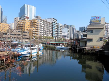 画像4は現在の「天王洲運河」の船溜まり現・風景。ここから運河沿いに右方向へ100mほど進むと運河は行き止まりとなり、