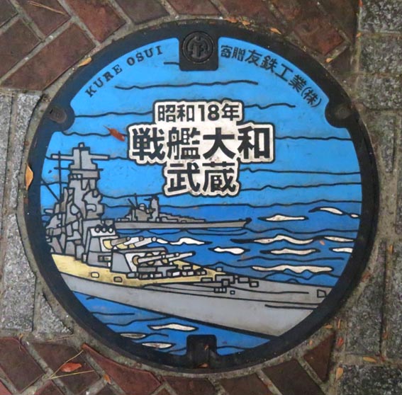 (旧・海軍病院坂)」の歩道をほんの少し進むと、戦艦「大和」をモチーフにしたデザインマンホール蓋が設置されている(同歩道で