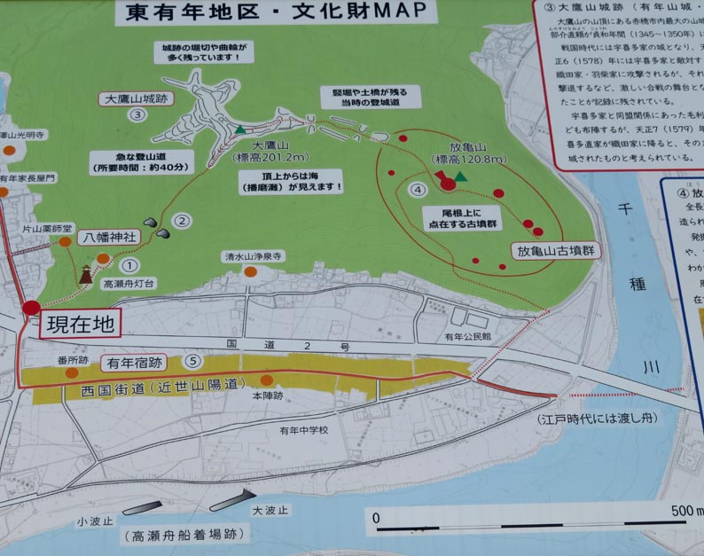 地図「東有年地区・文化財MAP」の出典: 「現在地」と記される八幡神社・大鷹山への登山道入り口(国道2号線のすぐ傍)に立てられている地区案内掲示板。