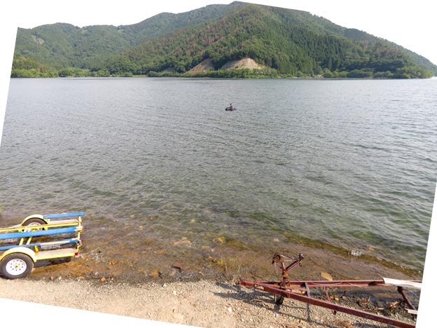 画像1・2は、琵琶湖のほぼ最北部湖岸に位置する集落・大浦(下図の左端)地先の、鏡のような滑らかな湖面に、ゴムボートを浮かべ釣り
