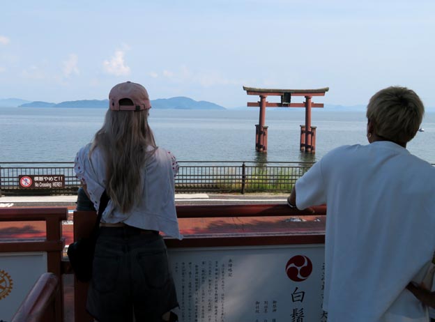 「白鬚」という社名が示す通り延命長寿の神が祀られるという。湖中に立つ大鳥居を背景に湖面に夕陽が