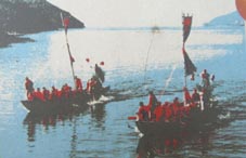 坂越の「船祭」で繰り出される2隻の漕船を写す。出典:「旧坂越浦会所」の案内板より。