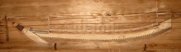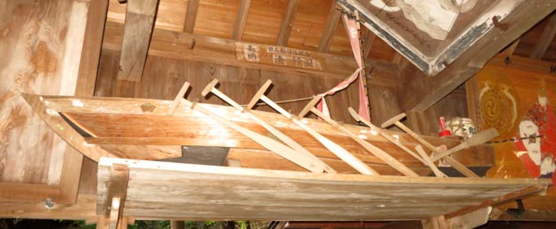 絵馬だけでなく、画像2のように船の設計図(断面図)に相当する「船板」や、画像3のように舟模型の奉納もある。