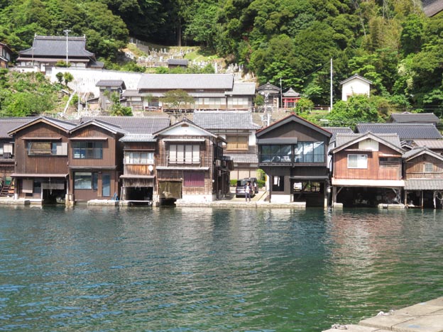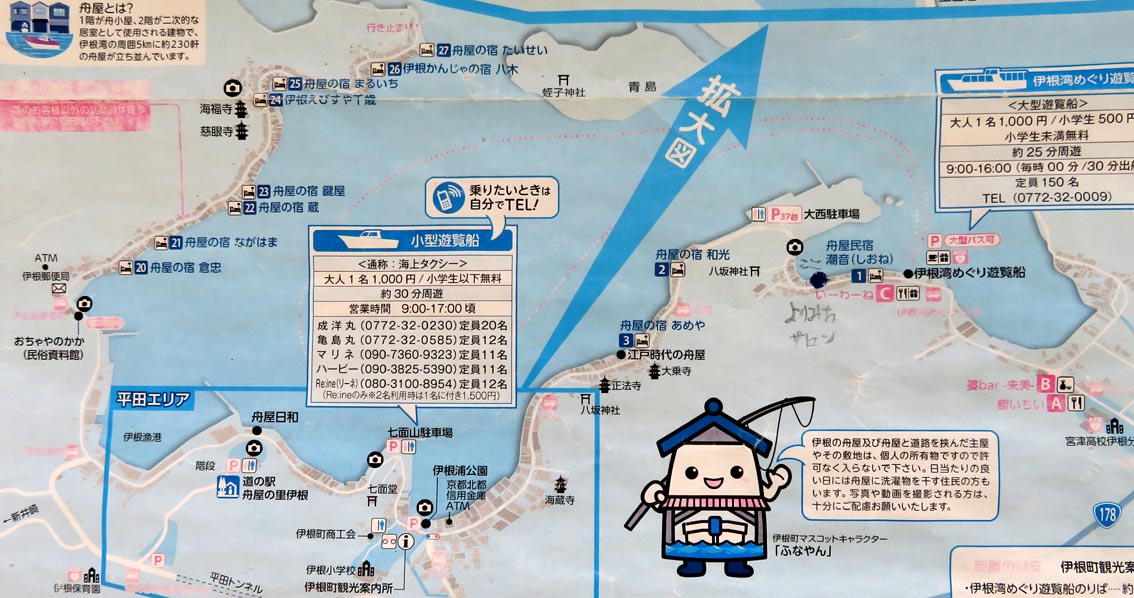 湾沿いの全体的な町並み風景やユニークな舟屋建築構造を海側から観るには遊覧船に乗船するのがベストである。乗船場は宮津から 伊根に接近して最初に出会う集落の「日出地区」にある。伊根町の観光案内所は「平田地区」に立地する。 boathouse: n.(pl. -houses)艇庫、舟艇収納庫; [社交場としても用いる]ボートハウス、ボート小屋、舟小屋/Funaya (boathouse, boat house): n.[例えば伊根の]舟屋(ふなや)[伊根湾に沿って200余軒の舟屋が軒を連ねる; 通例2階建てで1階はボート のガレージ(舟小屋)、2階は副次的な居間として使われる].