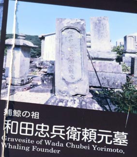 さて、太地の街中にある「順心寺」には、「太地捕鯨の祖」と言われる和田忠兵衛頼元の墓(Gravesite of Wada Chubei Yorimoto, Whaling Founder)があるが、その