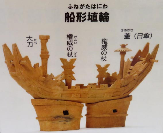 船形埴輪の特徴: 全長1.4メートルで日本最大級であり、かつ造形がリアルである。特に船上に立てられた飾りが特徴的であり、他に例がない
