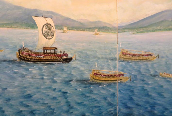 画像1・2は三重県伊勢市の「山田奉行所記念館」に展示される御座船「虎丸」の雄姿画、および同船の「水軍調練の図」である。