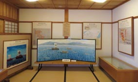 絵画「御座船虎丸の雄姿」や「水軍調練の図」などの資料の展示風景。