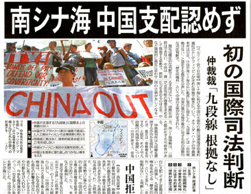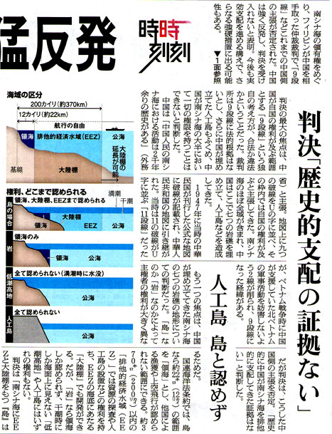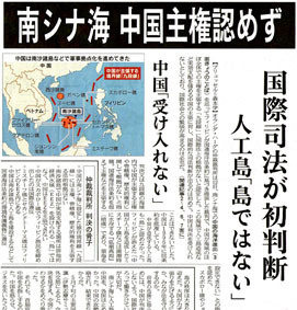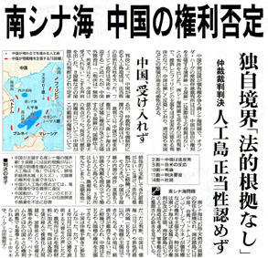 画像 2 は、「9段線「違法」 中国は猛反発」と題する2016年7月13日付け朝日新聞の記事である。仲裁裁判の判決内容を報じている。