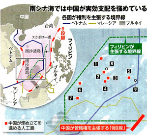 1. 中国は南シナ海に9本の境界線(「九段線」と称される)を断続的にU字型に引いて、中国大陸から南シナ海のかなりの部分を